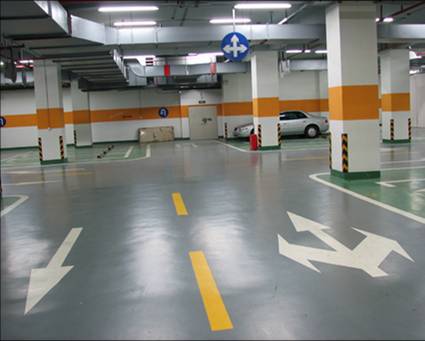停車場劃線工程施工時,如果車長不大6米及車寬不大于1.8米的車,規范車與車之間間距為不小于0.5米,車與墻、車位端之間間距不小于0.5米;車長大于6米不大于8米,車寬大于1.8米不大于2.2米的話,車與車之間間距不小于0.7米等。回車路段的相應規范是滿足一輛車一次性回轉的需要,這實際上為不同類型的停車場提供了不同的尺寸松動。因此對于一般以停小型車為主的停車場來講,車位尺寸多采用2.5~2.7×5~6的尺寸,而單車道回轉車道寬度不小于3.5米,雙車道不少于5米。